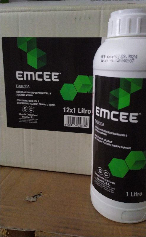 EMCEE è un erbicida concentrato solubile da utilizzare in applicazioni di post-emergenza su cereali autunno-vernini e primaverili per il controllo di infestanti latifoglie. Infestanti sensibili: Brassica nigra, Cirsium arvense, Galium aparine, Matricaria chamomilla, Papaver rhoeas. Infestanti mediamente sensibili: Convolvulus arvensis, Centaurea cyanus. EMCEE contiene MCPA in forma di sale di DMA come sostanza attiva. CAMPI D’IMPIEGO EMCEE è consigliato come erbicida in applicazioni di post-emergenza su cereali autunno-vernini (frumento, orzo, segale, avena e triticale) e cereali primaverili (frumento, orzo, segale e avena). DOSI E MODALITÀ D’IMPIEGO EMCEE deve essere impiegato dalla comparsa delle prime foglie fino alla formazione del secondo nodo per i cereali primaverili e dalla comparsa del primo nodo fino allo stadio di foglie a bandiera per i cereali autunno-vernini. Il trattamento deve essere effettuato in presenza di erbacce allo stadio iniziale (massimo 20-30 cm di altezza) alla dose di 1 L/ha, con volumi d’acqua di 200-400 L/ha, sia per i cereali primaverili sia autunno-vernini. Effettuare un solo trattamento per anno.