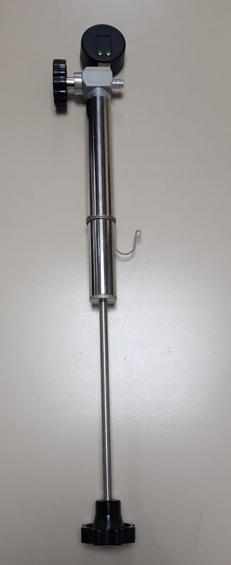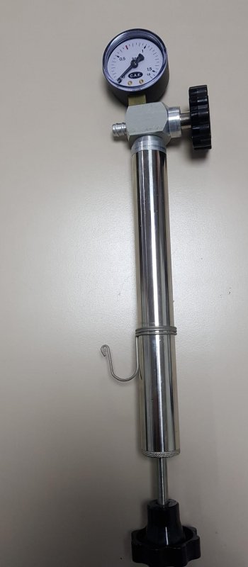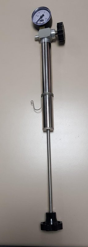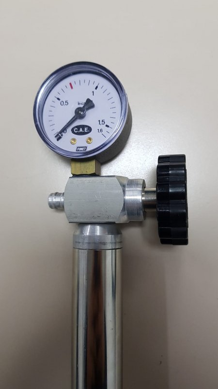 L'oggetto mostrato è un gruppo pompa manuale con manometro, utilizzato per il gonfiaggio della camera d'aria dei galleggianti pneumatici per serbatoi in acciaio inox, tipicamente usati per la conservazione di vino e olio.